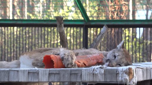 Пума Эри умывается и играет с конусом на лежанке. 26.04.2025