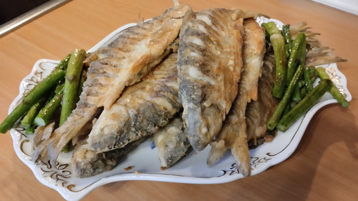 Фаршируем плотву зеленым луком и обжариваем, а рядышком жареная спаржа