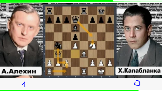 Хосе Капабланка за черных, Александр Алехин - за белых. Партия матча 1927 года №5 с чистой, уверенной победой Капы (Индийская защита, 0-1)