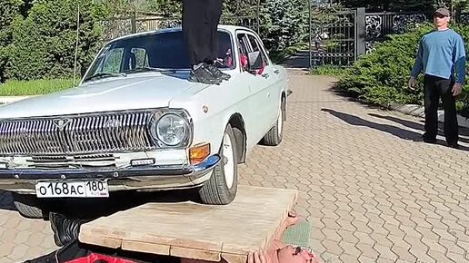 Дмитрий Халаджи, лежа на битых стеклах удерживал автомобиль"Волга" - ГАЗ - 24, с девушкой на капоте,которая 80 раз подняла гирю весом 8 кг.
