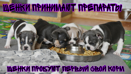 Щенки растут. Приём необходимых препаратов. Щенки первый раз пробуют новую еду!
