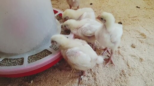 Юные птенцы-бройлеры поселились в курятнике.