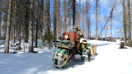 Путешествие на самодельном снегоходе. Спасение снегохода из болота.