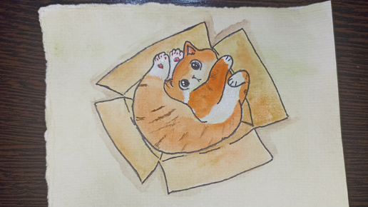 Кот в коробке / Рисунок акварелью
