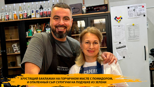 Закуска из хрустящего баклажана, розового помидора и опаленного сыра сулугуни на подушке из зелени на нерафинированном горчичном масле