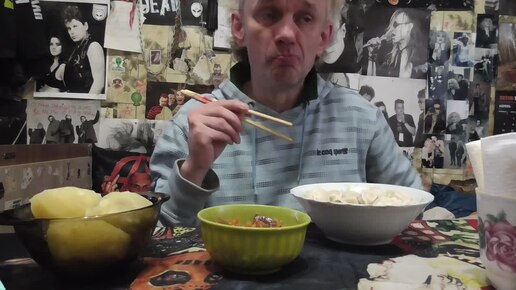 мукбанк пельмени русские ретимир картофель отварной чай маринованые бакложаны