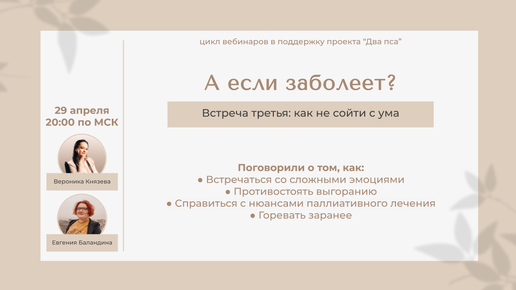 "Как не сойти с ума?" - третья встреча цикла вебинаров "А если заболеет?" с Вероникой Князевой и Евгенией Баландиной