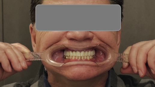 Удалили все зубы на верхней челюсти и установили протез. Имплантация "всё на 4" + птеригоидный имплантат - временный адаптационный протез
