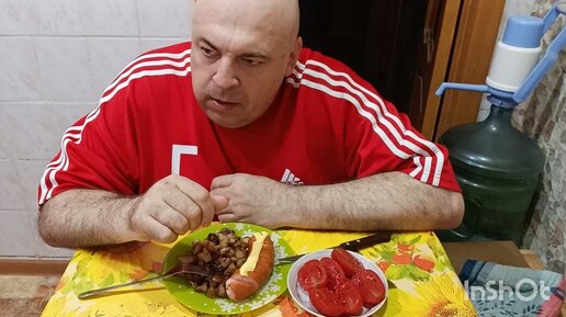 Мукбанг. Картошка жареная с баклажанами, сарделька и соленые помидоры. Апостолы Ленинграда.