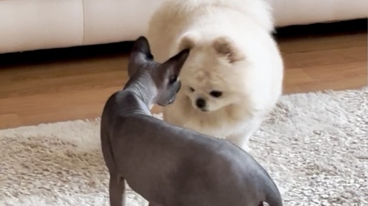 Осмелел кот, к собаке в тарелку своим носом лезет😼