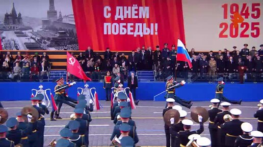 Военнослужащие почётного караула вынесли на Красную площадь флаг России и Знамя Победы.