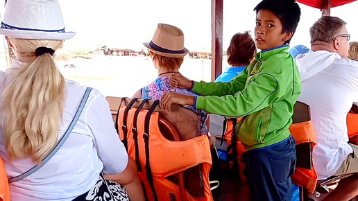 Мальчик камбоджиец делает массаж туристке во время путешествия по озеру Тонлесап в Камбодже.