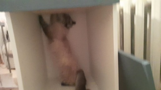 Котёнок-подросток в кухонном шкафчике