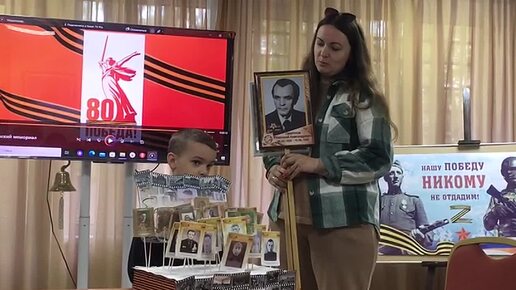 Мама Никиты Тер-Оганезова из научно-познавательного клуба «Окружайка» рассказывает о своих дедушках на патриотическом мероприятии.