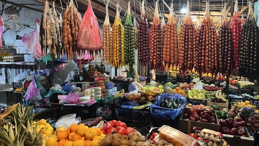 Тбилиси. Фрукты и овощи в павильоне на Авлабаре. Вкусная клубника, молодая картошки и зелень.Яркий павильон Майи и Джумбера.