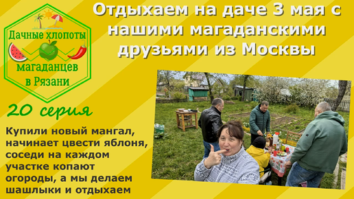 Отдыхаем на даче 3 мая с нашими магаданскими друзьями из Москвы. Новый мангал, зацветает яблоня, копают огороды, а мы делаем шашлыки и отды