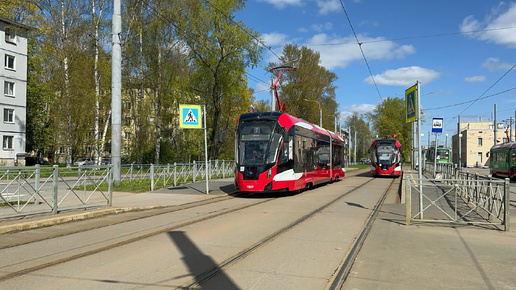 "Встреча!" Трамваи "Невский" (71-932) №7786 и "Богатырь-М" (71-923М) №7809 на Гранитной ул., май 2025 года