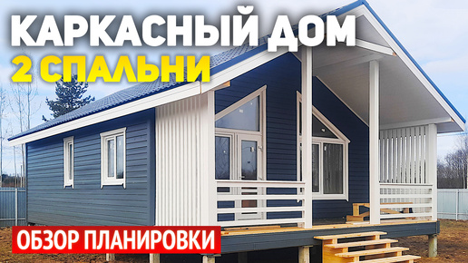 Проект одноэтажного каркасного дома 7х9 с террасой и крыльцом: 2 спальни, кухня-гостиная, ванная, прихожая, холл