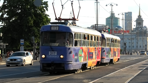 Трамвай Екатеринбурга Tatra T3SU СМЕ борт. №217/218 маршрут 13 на остановке "Театр Музкомедии"