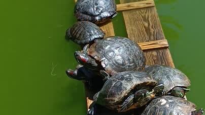 Множество Красноухих черепашек в парке культуры в Лазаревском