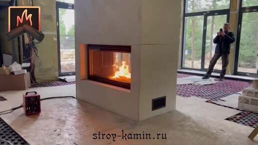 Туннельная топка АСТОВ ПТ 10057 в центре гостиной, как промежуточный этап при строительстве двустороннего дровяного камина