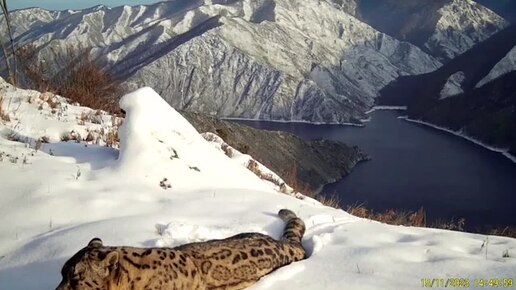 Ирбис по кличке Чужак разлегся на вершине хребта в Саянских горах в Саяно-Шушенском заповеднике.