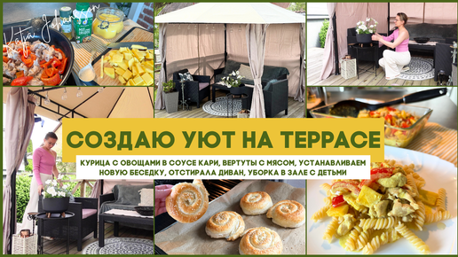 НОВАЯ БЕСЕДКА НА ТЕРРАСЕ🤩 КУРОЧКА В СОУСЕ КАРИ🍛ВЕРТУТЫ С МЯСОМ👌УБОРКА С ДЕТЬМИ 🧹