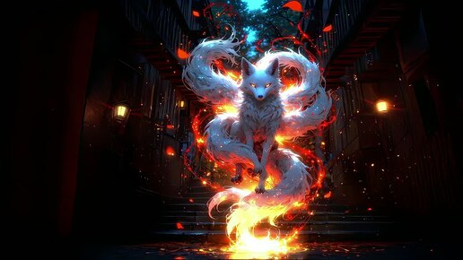 Кицунэ - Многохвостая Лисица | Fantasy Multi-Tailed White Fox - Живые Обои