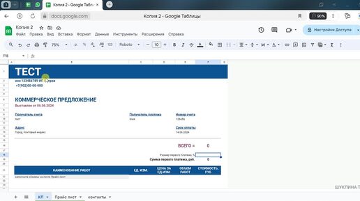 2. Коммерческое предложение на услуги в Google (гугл) таблице