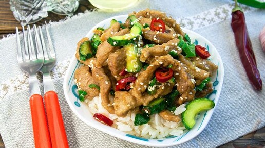 Яркий вкус с пикантной ноткой. Жареная свинина с огурцами