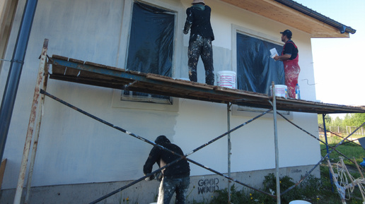Нанесение Камешковой Декоративной Штукатурки Ceresit CT174 на фасады дома бригадой фасадчиков. Металлическая и пластиковая тёрки