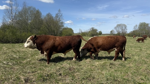 Быки пасутся, коровы сено едят и новое пастбище открыли #герефорд #корова #бык #ферма #фермер #природа #животные #деревня #Ленобласть