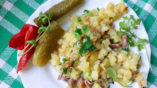Картошка жареная на сковороде с луком, колбасой, беконом.