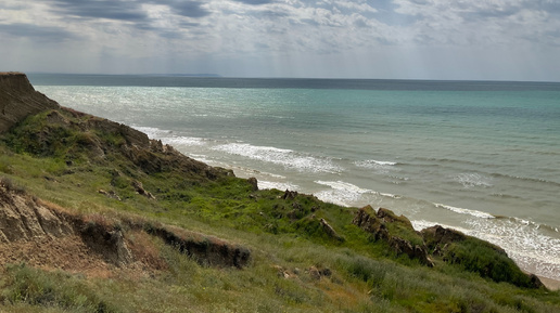 Чёрное море волнуется. Сильный ветер поднимает волны и гонит их к берегу. На песке видны вкрапления мазута.