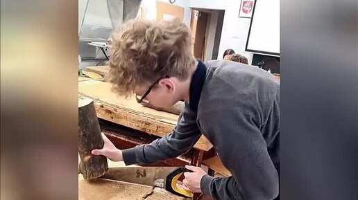 Урок труда в Литве: подростка попросили показать, как правильно пилить чурку...