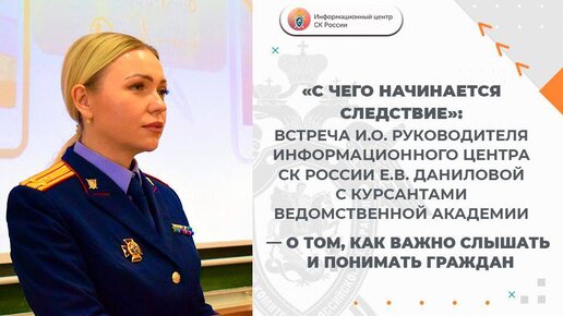«С чего начинается следствие»: встреча Е.В. Даниловой с курсантами ведомственной академии — о том, как важно слышать и понимать граждан.