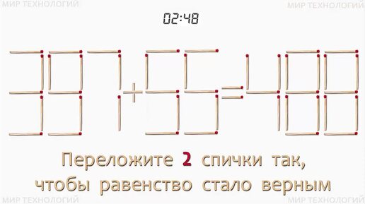 Задача со спичками 514. Переложите 2 спички так, чтобы равенство стало верным (397+55=488).