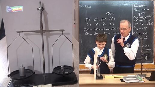 Измерение массы тела на рычажных весах с помощью набора гирь.