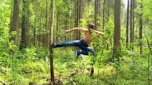 Тренировка ударов каратэ в лесу. Каждое сухое дерево - макивара.