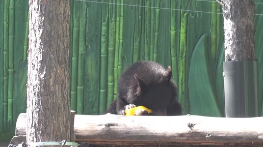 Медвежонок Дуся играет с игрушкой на помосте. 01.06.2025