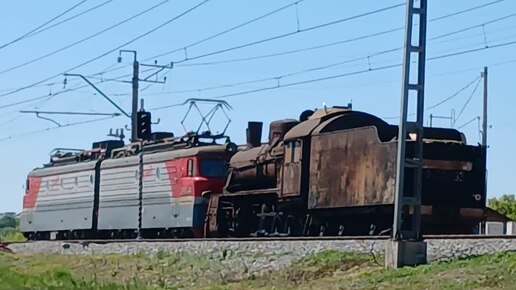 ВЛ10У-494 со старым паровозом серии Эр на переезде Давлеканово.