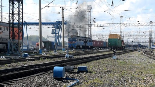 Тепловоз 2ТЭ116У-0025. Отправление с контейнерным поездом.
