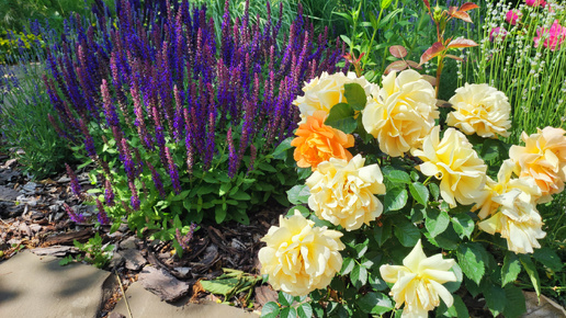Наш сад в начале июня. Розы, шалфей, клубника, жасмин.