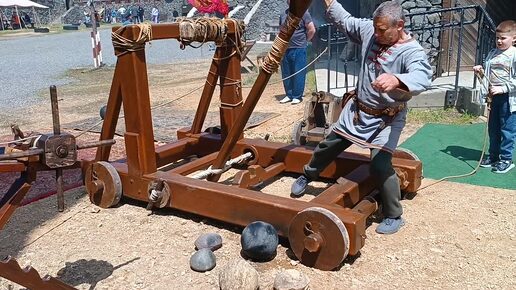 Современный чудо-богатырь метает средневековые ядра.