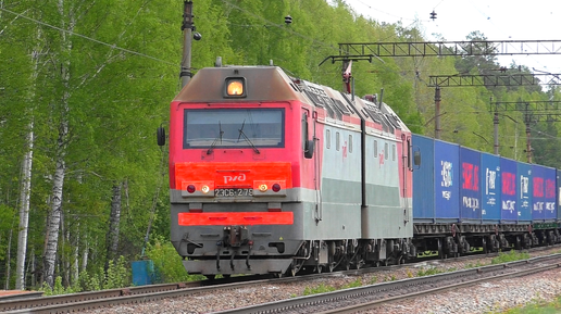 2ЭС6-279 "Синара" с контейнерным грузовым поездом останавливается на перегоне