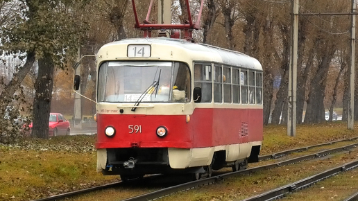 Трамвай Екатеринбурга Tatra T3SU борт. №591 следует по маршруту 14 по проспекту Космонавтов