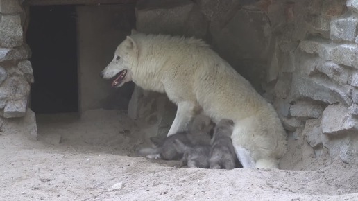 Арктическая волчица кормит своих пятерых волчат. 10.06.2025