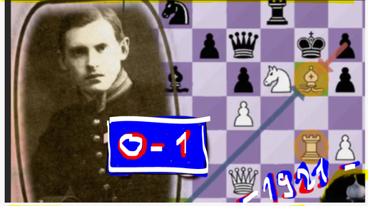 Александр Александрович Алехин (черные) красиво выигрывает у Алексея Селезнева в Триберге, 1921. Индийская партия, вариант Капабланки, 0-1
