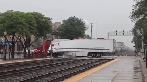В США поезд протаранил фуру, протащил ее несколько метров и повредил здание вокзала
