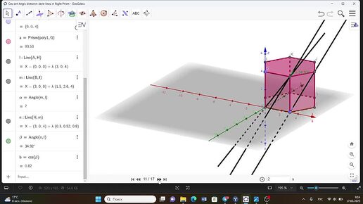 Как найти косинус угла между скрещивающимися прямыми правильной шестиугольной призмы в Geogebra?
